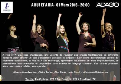 Loin d’une interprétation puriste du répertoire traditionnel, A hue et à dia réarrange, agrémente les chants de leurs improvisations, de percussions instrumentales et corporelles pour trouver un langage commun. Ces chants prennent alors une couleur inédite, intemporelle.