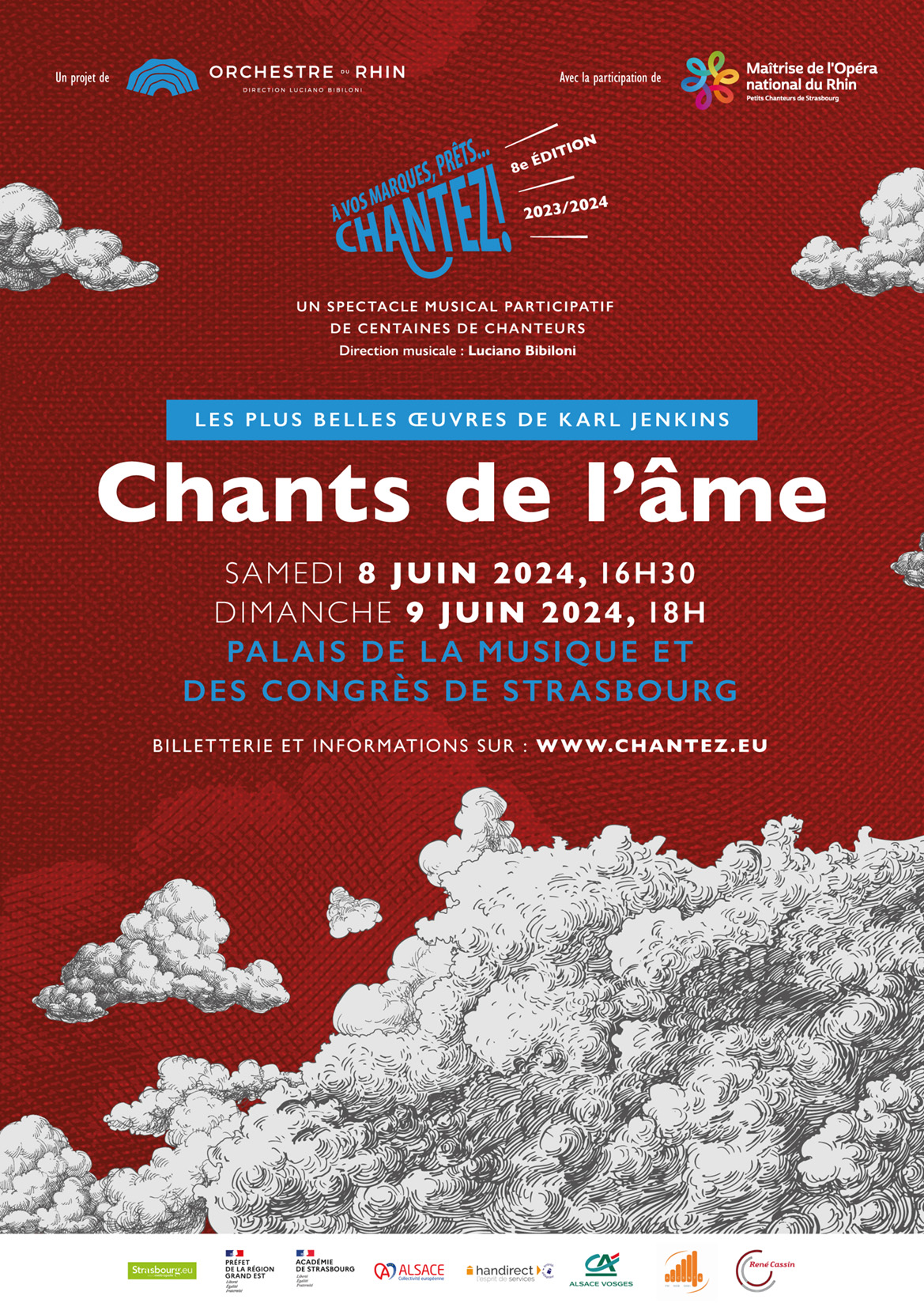 Un programme « Chants de l’âme », autour des plus belles œuvres du célèbre compositeur Karl Jenkins dans son oratorio appelé Symphonic Adiemus. Cette grande œuvre est une synthèse de plusieurs années de recherches et découvertes musicales puissantes. Beaucoup de ces mélodies ont été entendues dans des films, tels qu’Avatar. Un programme qui laissera place à la rêverie, à l’imaginaire et bien sûr, à la beauté de la communion de toutes les voix. Ce concert, pensé autour de l’inclusion et d’épanouissement au travers de la pratique artistique, réunira des centaines de chanteurs adultes mais aussi les enfants des établissements scolaires et des écoles de musique de l'Eurométropole de Strasbourg ainsi que des adolescents issus d’instituts médico-éducatifs du département.