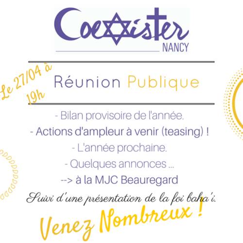 Mercredi 27 à 19h, Coexister Nancy tiendra sa grande réunion publique portant sur la fin d’année et l’année prochaine. Au programme des annonces et des projets d’ampleur inédite, venez nombreux ! L’occasion aussi de prendre part à l’organisation des actions de fin d’année et de découvrir le groupe de l’intérieur :)