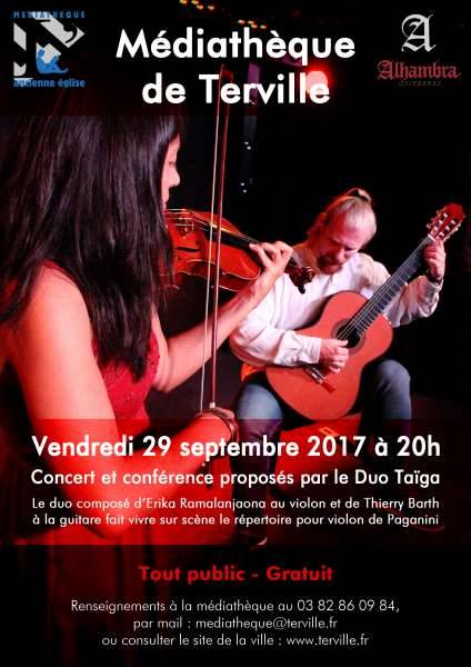 C’est au cœur de la musique de l’Italie classique que le Duo Taïga va vous emmener, pour un voyage dans l’univers d’un des plus grands musiciens de tous les temps : Niccolo PAGANINI. Violoniste, guitariste, compositeur, bête de scène, cette "rock star" de son époque est souvent adoré, nourrissant de nombreux mythes sur sa vie, il est l’un des musiciens les plus créatifs de son temps. C’est dans le répertoire écrit pour les deux instruments, qu’Erika et Thierry vont vous faire découvrir toute la finesse de son écriture. Ses œuvres d’une rare élégance, sont aussi un reflet du bel canto, très en vogue à son époque au sein de l’art de l’opéra. Pour terminer ce « concert-conférence », les artistes vous réservent des œuvres chaleureuses aux couleurs de l’Amérique latine, aux histoires passionnantes.