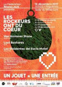 Chaque année les concerts de l’opération permettent de récolter des centaines de jouets et de livres qui seront ensuite reversés à diverses associations et permettront ainsi d’égayer le Noël des enfants les plus défavorisés. Pendant le mois de décembre il sera également possible de venir déposer livres et jouets aux Bains Rock de Haguenau (6 place Robert Schuman).