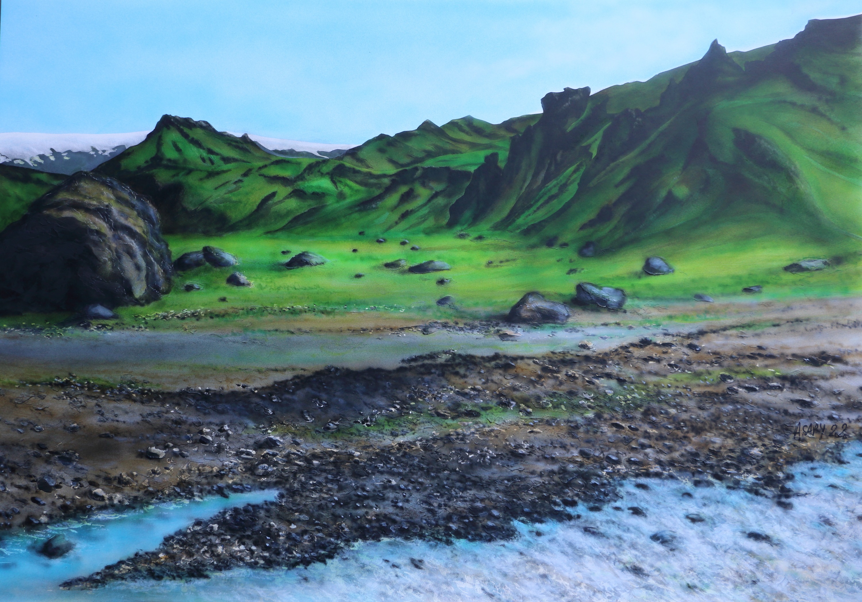 Un sentiment de plénitude m’envahit lorsque je suis en Islande et de mes voyages je ramène des photographies qui deviennent le « déclencheur » de mes créations picturales. Je ne peins que ce que j’ai vu, vécu.