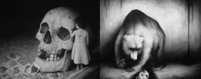 L’ombre n’est pas pour Soren un moment ou un élément du monde visible. Elle est substance originelle, elle est son miroir le plus intime. En la travaillant dans son épaisseur, sa densité (au fusain, à la pierre noire), il accouche d’une étrange lumière. Une lumière intérieure, vivante, douloureuse. Les ténèbres se sentent avec la peau. Soren malaxe lumière et ombre, les triture avec ses doigts, tel un étrange démiurge, obscur à lui-même. En lui couvent depuis si longtemps les êtres de ses cauchemars, les douleurs silencieuses, et tous ces songes troubles, comme des blessures dont on ne peut pas guérir. Ainsi ses dessins sont comme ses enfants, ses doubles, d’insistants fantômes « ... » La blessure hante le dessinateur. Toute son œuvre s’affronte, dessin après dessin, à une vie plus trouble, plus dangereuse que celle qui nous emporte à notre insu « … » Dans cette autre nuit qu’est l’œuvre de Soren, s’ouvre enfin une fleur malade, notre œil. »