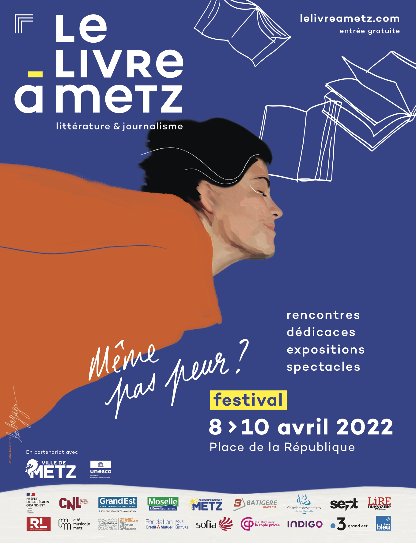 Après une année 2021 inaccoutumée, le festival Le Livre à Metz – Littérature & Journalisme s’installera à nouveau Place de la République à Metz du 8 au 10 avril 2022. Cette année, l’audacieuse thématique « Même pas peur ? » invite à mettre en avant le courage, l’audace et à penser la vie sans en renier les côtés sombres.