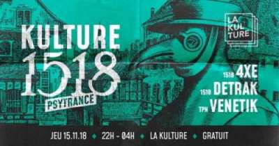 1518 Débarque à La Kulture pour une toute première soirée psytrance dans ce lieu ! Venez taper du pied un jeudi soir jusqu’au bout de la nuit avec nous pour cette soirée gratuite !! Pour cette première soirée nous avons le plaisir d’inviter Venetik de l’association TPN pour un set psytrance/full-on en finish et vous retrouverez 4XE et Detrak de 1518 en minimal prog et psytrance !