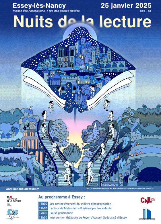 La Ville d’Essey-lès-Nancy, en partenariat avec la Bibliothèque pour Tous, prend part à la neuvième édition des Nuits de la lecture le samedi 25 janvier. « Les patrimoines » est le thème choisi cette année au niveau national. À Essey, les festivités débuteront à l’espace Bérin à 16h avec Les contes émerveillés, du théâtre d’improvisation familial accessible à tous dès 5 ans. À 17h, des enfants volontaires liront des fables de La Fontaine. Jusqu’au 21 décembre, ils étaient invités à choisir une fable de l’homme de lettres du Grand Siècle et à s’inscrire pour venir la lire seul ou à plusieurs le jour J. À 17h30, les participants savoureront un délicieux goûter. À 18h, le Foyer d’Accueil Spécialisé d’Essey proposera une intervention théâtrale, Enfin, cette après-midi d’animations s’achèvera par une dégustation de soupe.