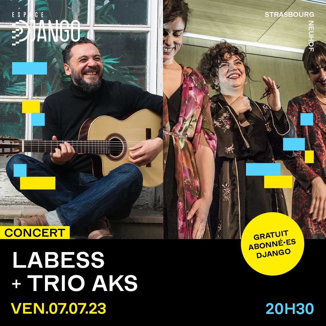 Salam, bienvenue au dernier concert en salle de la saison ! Labess vous prépare une grande fête pour l’occasion, une célébration en grandes pompes de traditions musicales du monde entier. Une fête au cours de laquelle on se rencontre, on danse, on échange en français, en arabe, en espagnol notamment. La musique de Labess, c’est le chemin vers une transe collective ; du chaâbi, teinté de chanson française, de la musique colombienne, et d’autres grooves qui ont inspiré Nedjim Bouizzoul et sa voix aussi chaleureuse que généreuse. En ouverture, le trio AKS, réunissant Kahina Afzim, Zeynep Kaya et Merve Salgar, dévoilera un répertoire de mélodies méditerranéennes accompagné de quelques percussions, où les voix, les styles, les langues prendront un malin plaisir à s’entremêler. Une musique à la fois plurielle et intime, pour une belle soirée d’été en perspective. Une musique habitée. Une musique libre. Beslama.