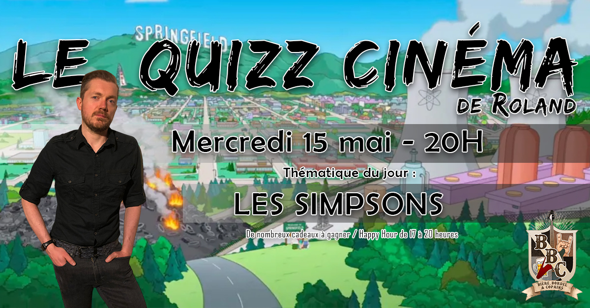 Le QUIZZ CINE de Roland vous réserve des questions et des énigmes qui vous transporteront dans les aventures déjantées de la famille Simpson. Que vous soyez fan de Homer, de Bart, de Marge, de Lisa ou de Maggie, cette soirée sera une ode à l'humour et à la folie de la série animée la plus emblématique de tous les temps. ??