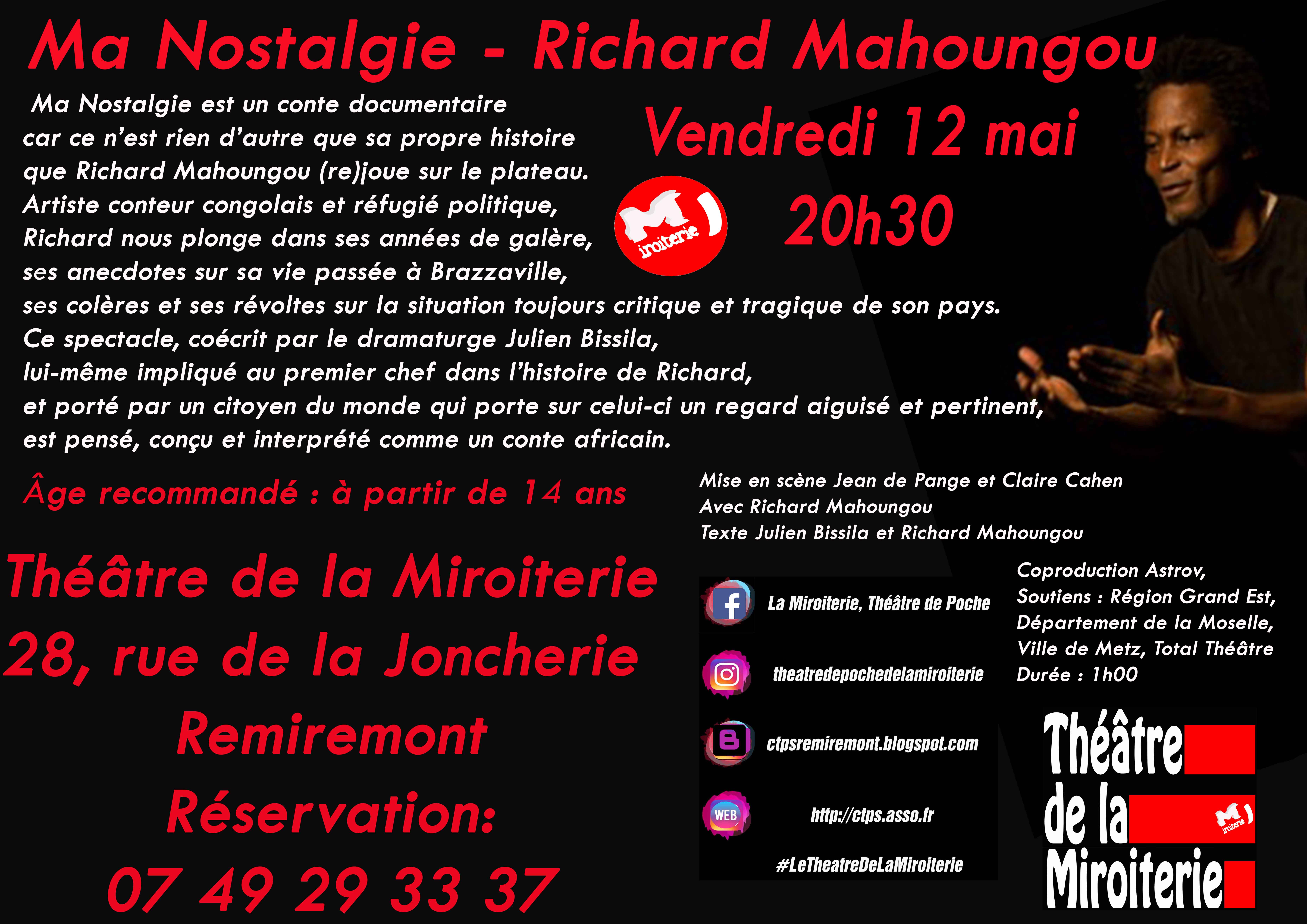 Construit comme un conte documentaire, le spectacle Ma Nostalgie, interprété par l'artiste Congolais de Brazzaville Richard Mahoungou n'en demeure pas moins un conte conçu et interprété comme un conte africain. A découvrir à la Miroiterie de Remiremont. a partir de 14 ans.