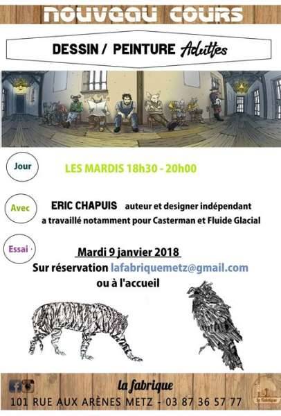 Il s’agit d’un cours hebdomadaire (hors vacances scolaires) encadré par Eric Chapuis, auteur designer indépendant (Fluide Glacial, Casterman..)Tarif :