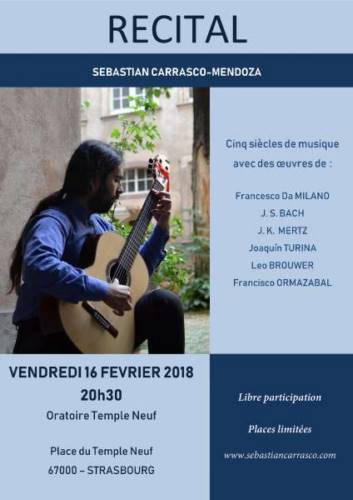 Le guitariste Sebastian CARRASCO-MENDOZA vous propose un récital consacré aux cinq siècles de la guitare et ses ancêtres. Grâce à de belles fantaisies de compositeurs tels que Francesco da MILANO et Alessandro PICCININI, nous pouvons apprécier la sonorité de la renaissance, et ensuite apprécier la musicalité de BACH où chaque pièce devient une oeuvre immense en toute dimension.