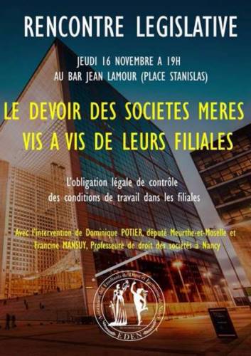 Ce jeudi, l’association EDEN vous propose une rencontre avec le député de Meurthe-et-Moselle Dominique Potier qui viendra nous parler de la nouvelle loi (dont il a été l’initiateur) sur le devoir des sociétés mères vis-à-vis de leurs filiales, un sujet pleinement ancré dans l’actualité (et dans le programme de droit des sociétés !). Nous avons également le plaisir d’accueillir Mme Francine MANSUY, professeur à l’Université de Lorraine.