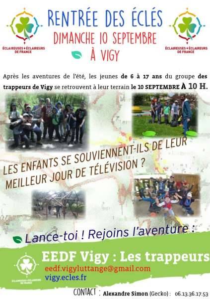 Le dimanche 10 septembre, les lutins (6-8 ans), louveteaux (8 à 11 ans), éclés (11 à 15 ans), aînés (15 à 17 ans) et respons se retrouveront à 10 heure au terrain d’aventure des éclés de Vigy. Info à suivre, n’hésitez pas à nous contacter. eedf.vigyluttange@gmail.com vigy.ecles.fr