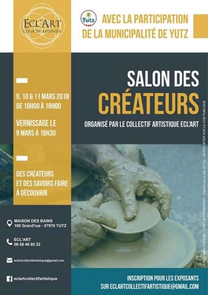 Le collectif artistique Ecl’Art avec la participation de la municipalité de Yutz vous présente son premier Salon Des Créateurs. Du vendredi 9 mars au dimanche 11 mars 2018, de 10h00 à 18h00.