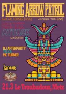 Ne de la fusion des groupes TiNG et Tubby Love, Flaming Arrow Patrol est une experience musicale. Un voyage en impro autour du Live Dub avec des musiciens a vous couper le souffle Berklee School).Energique, hypnotique, dansant et musicalement tres recherche, Flaming Arrow Patrol, c est un groupe a ne pas manquer. Ils passent a Metz pour leur tournee Europeenne et vont vous retourner le Troubadour.