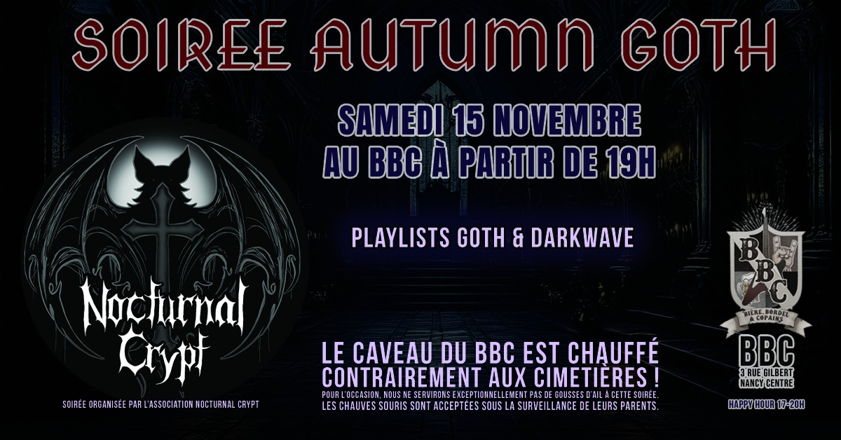 Samedi 15 novembre, le BBC se pare de noir pour accueillir une soirée où les âmes sombres viendront danser à la lueur des bougies. Organisée par l’association Nocturnal Crypt, cette nuit sera rythmée par des playlists goth et darkwave, entre mélancolie élégante et frissons poétiques.