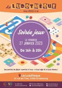 Rendez-vous à la cinquième soirée jeux de la Ludo’ : animation, convivialité et plaisir seront au rendez-vous autour de jeux de société pour finir la semaine dans une ambiance ludique ! En famille, entre jeunes, à tout âge, seul ou à plusieurs, cet instant inédit est ouvert à tous et à tous les niveaux, débutant ou confirmé, guidé par l’expérience des ludothécaires qui seront présents sur place. Ce moment de rencontre et de partage entre adhérents, habitants et habitués du quartier du Conseil des XV se déroulera le vendredi 27 janvier 2023 de 16h à 20h, à la Ludothèque au 24 rue de l’Yser à Strasbourg.