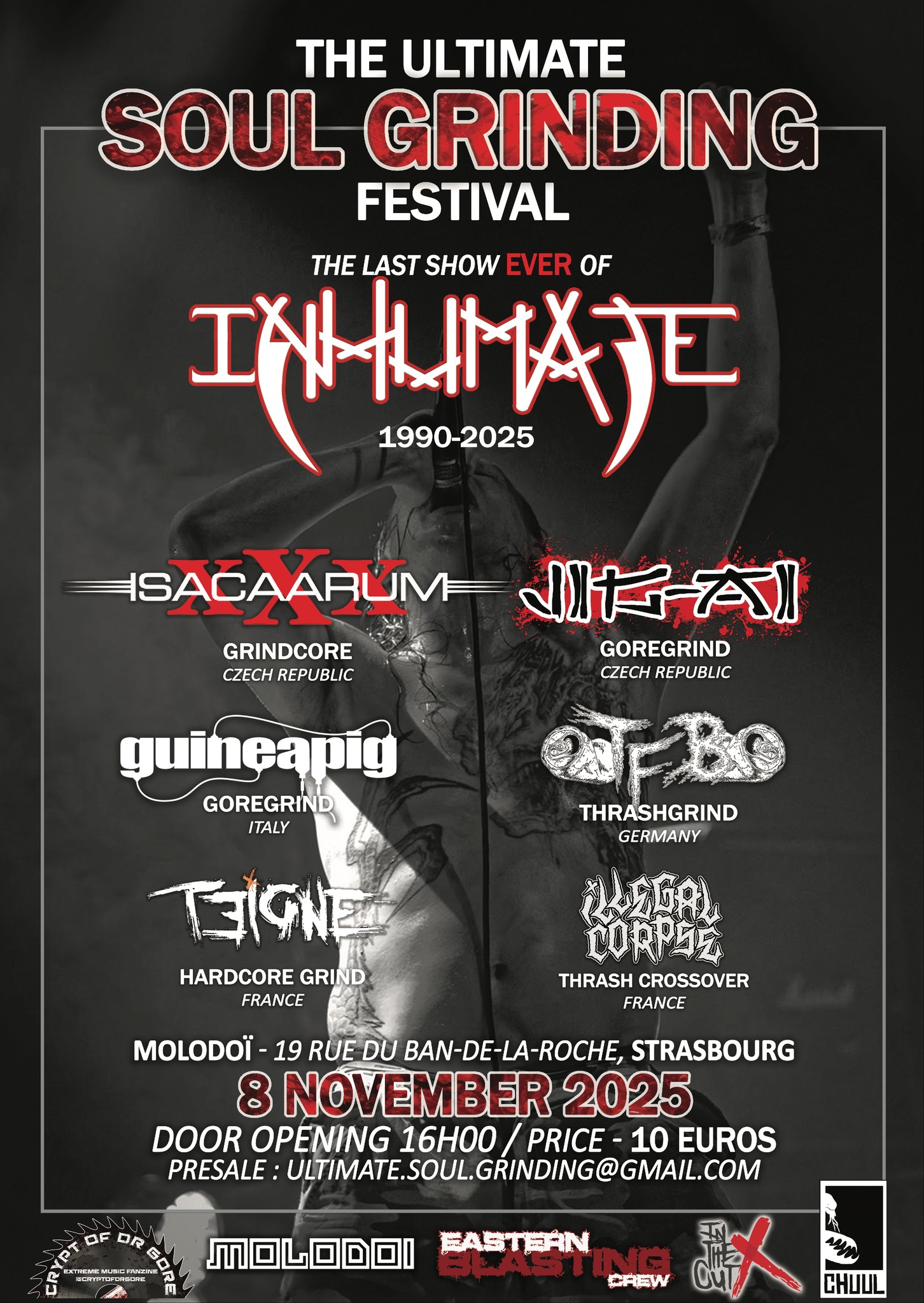 - - Il n'y aura jamais de comeback. Cela étant dit, c'est avec une grande émotion que nous pouvons enfin partager officiellement l'affiche de cet ultime concert ! Pas de grosses têtes d'affiche ni de projet clinquant plus grand que nous, juste 6 putains de groupes avec lesquels nous sommes heureux de pouvoir partager ce dernier tour de piste, dans l'esprit de ce que nous avions fait avec nos Soul Grinding Festival à Strasbourg de 2001 à 2007.