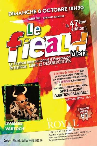 Le F.I.E.A.L.D (Festival International d’expression artistique libre et désordonnée) de METZ, c’est un p’tit coup de pouce pour votre promo chers artistes!!N’oubliez-pas que si vous avez un talent quel qu’il soit, vous pouvez participer aux sélections à 17H pétantes et nous le faire découvrir sur scène durant 5 minutes montre en main. On vous offre une scène, une technique et surtout un public de folie.