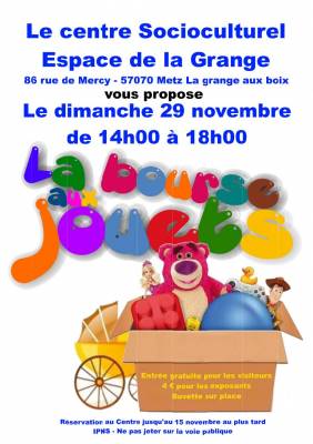 Le Centre Socioculturel "Espace de la Grange" vous propose une bourse aux jouet, de 14h00 à 18h00.