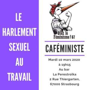 Le prochain caféministe porte sur le harcèlement sexuel au travail. Il touche beaucoup de femmes. Comment repérer les situations de harcèlement, comment y mettre un terme, comment soutenir les victimes, venez en parlez avec nous.
