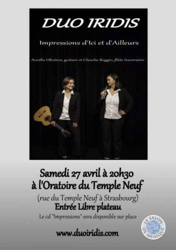 Venez savourer un moment d’évasion en couleur avec le Duo Iridis composé de Claudia Reggio à la flûte traversière et d’Aurélie Olivéros à la guitare. Le Duo vous proposera le programme "Impressions d’Ici et d’Ailleurs" qui vous transportera d’une ambiance à l’autre au fil du concert.