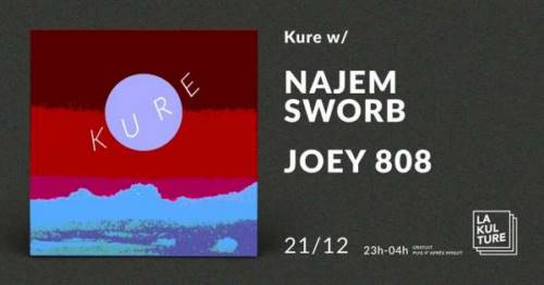 "Cela fait depuis l’ouverture de La Kulture, que Najem Sworb et Joey808 viennent régulièrement jouer au club. Sans se connaître, ils adoptaient une sélection similaire, un toucher et une sensibilité comparable. Atomes crochus entretenus, les 2 compères lancent leur résidence nommée «KURE» !"
