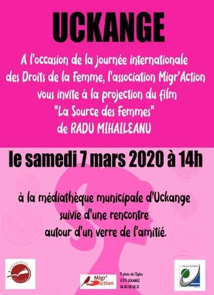 A l’occasion de la journée internationale des Droits de la Femme,l’association Migr’Action vous invite à la projection du film "La Source des Femmes" de RADU MIHAILEANU à la médiathèque municipale d’Uckange le samedi 7 mars à 14h,suivie d’une rencontre autour d’un verre de l’amitié.