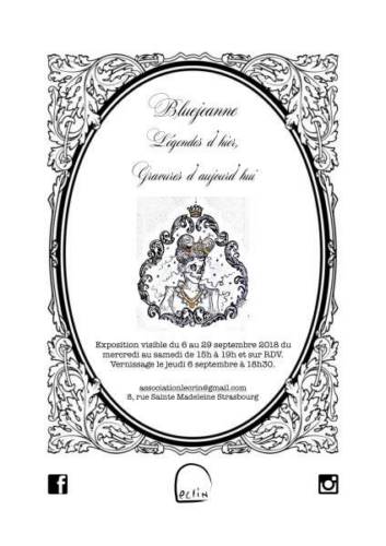 Férue d’histoire, de contes et légendes ainsi que de gravures anciennes, il est temps pour BlueJeanne de rattacher, à ce stade de son parcours, un wagon de son histoire. Bienvenue en Alsace, terre de légendes où se côtoient les récits les plus noirs et les mythes les plus féeriques. Bienvenue dans l’antre qu’est l’Ecrin pour tout le mois de septembre, dans lequel on découvre intimement un folklore où viennent se mêler les civilisations latines et germaniques. C’est la rentrée, chacun reprend le chemin de ses obligations, laissant derrière lui la chaleur des longues journées d’été. L’ambiance lourde de nostalgie pousse le rêveur qui sommeille en chacun de nous à se réfugier dans ses pensées, à voyager par la force du souvenir, et à vagabonder de légendes en histoires, et de contes en mythes. L’Ecrin se présente alors comme le havre de l’imaginaire, offrant une trêve dans le quotidien, une parenthèse enchantée pleine de poésie et de subtilités. Septembre, retour en Alsace, il est plus que jamais l’heure d’ouvrir les yeux sur la beauté du patrimoine que notre contrée nous offre. Les légendes s’enracinent dans leterreau régional et familial, créant des instants propices aux confidences... Les livres s’ouvrent, et laissent s’échapper l’inattendu. Dans cette exposition se côtoient alors la magie de l’or et la peur des ombres, le cuir d’une ancienne carte au trésor et les vestiges de la tête d’un cerf, le tout solidement cousu par l’univers raffiné de BlueJeanne. Afin de faire vraiment exister ces histoires, un conteur viendra donner vie au lieu et à ces illustrations, en proposant aux plus jeunes une occasion de s’immerger dans leur culture. Restez à l’écoute...