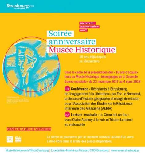 - Conférence Résistants à Strasbourg, de l’engagement à la Libération par Eric Le Normand, professeur d’histoire-géographie et chargé de mission pour l’AERIA (Association des études sur la résistance intérieure des Alsaciens.